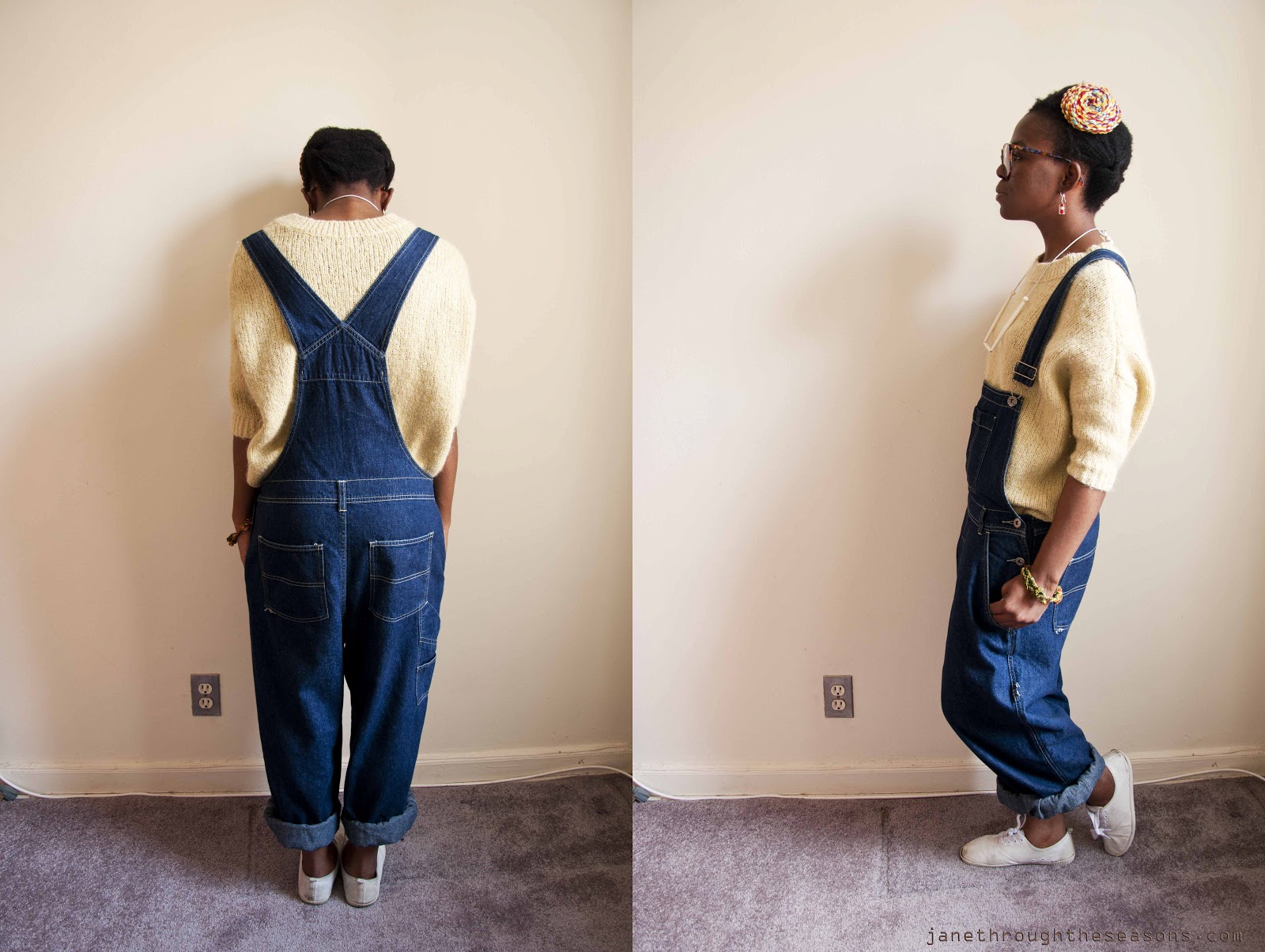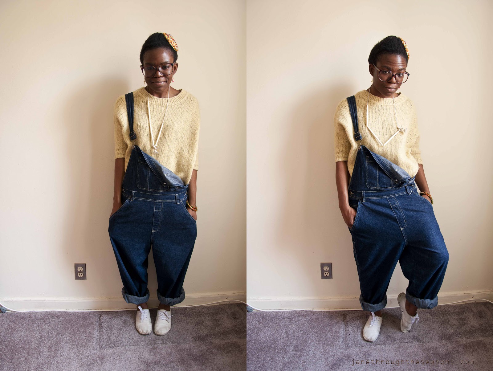 Pondering what to wear to school, I saw Chandra in her overalls and thought that was a great answer. Love this overalls; had a pair in khaki too, but it got awfully stained and I had to say farewell… I’ve had them forever…or almost forever — so many memories. See my sweet and fun new necklace from An Astrid Endeavor. I love that it is not fixed into place and I can therefore play with it and wear it anyhow I wish. In the last photo, my new school bag – which I absolutely adore, sits on top of my head. I stumbled upon her in Marshalls for $24.99 ^_^