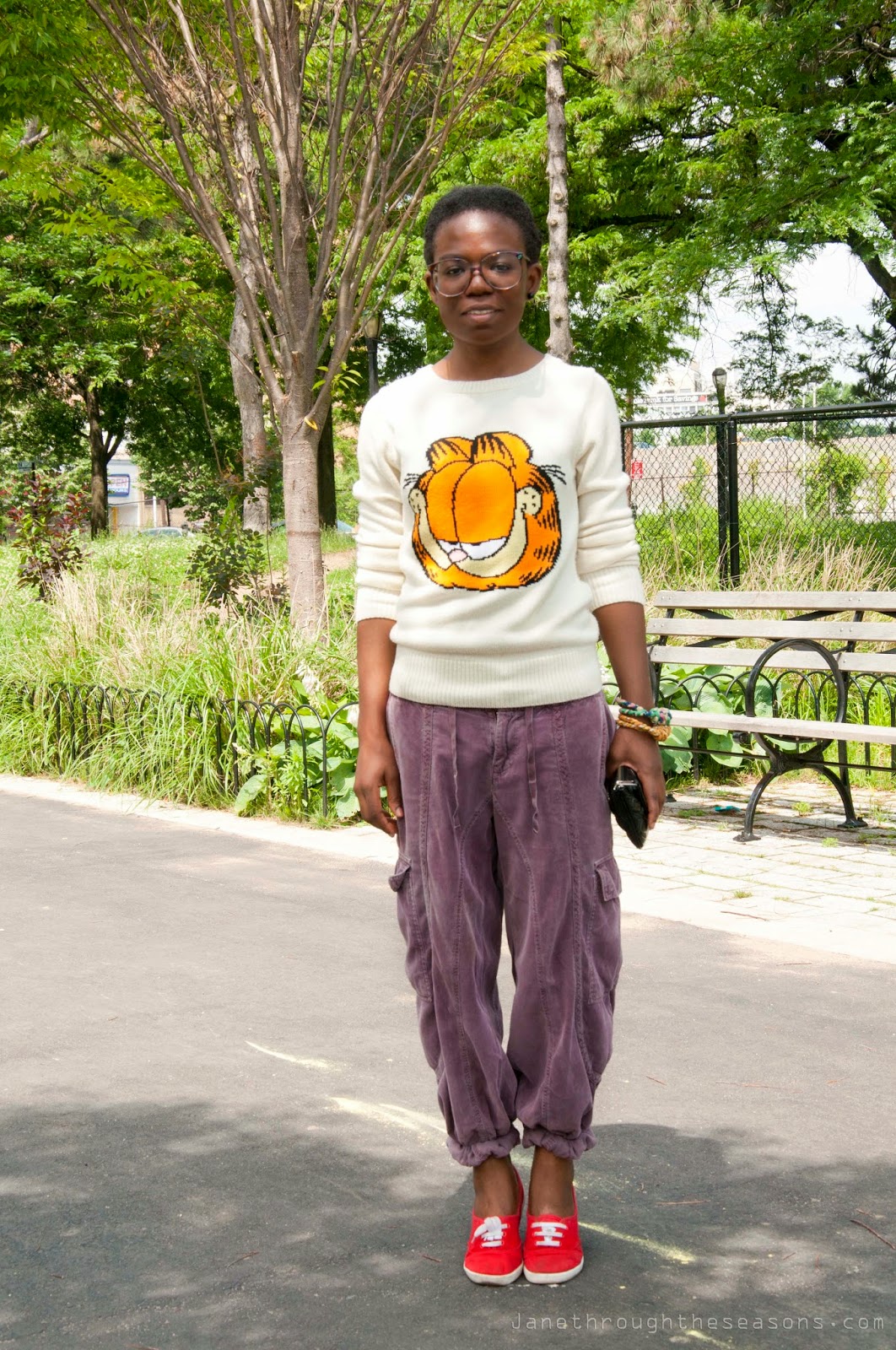 And a Garfield Sweater! This pair of pants is my ALLLLLLL time favorite. It has some turmeric stains on it, a few holes in the most ridiculous places, and it is soft, comfortable, pink, fun, and perfect! I change it a tiny bit after I got it. I added some colorful buttons that you can’t see because of the sweater,  and removed the straps that came with it. I love to wear it with the bottoms rolled up–because I am short, but sometimes I don’t because it changes the look, and I love that look too.