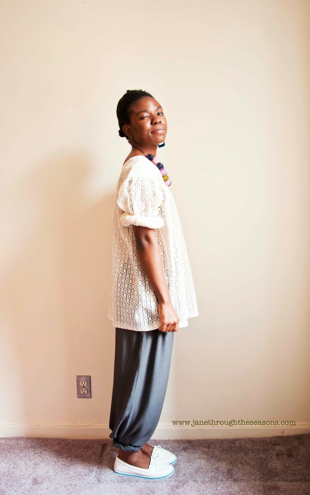See my new favorite pants! I discovered it in my closet a few weeks ago with the tag still attached. It’s a hundred percent silk and a thousand percent comfortable. She told me (the seller, of the lace top that is) that the blouse was handmade by her grandmother back when she was a young lady! The necklace and earrings I got from two cool handmade jewelry shops on Etsy.