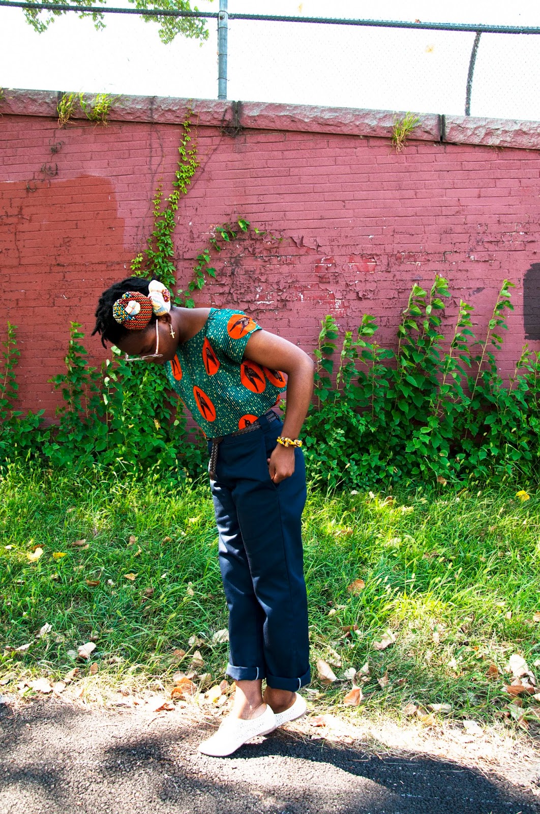 I love how much wax print I am wearing in this outfit and how all the pieces are contemporary and manage, somehow, to not be overwhelming. In my hair are my Dipoyo Pillbox hats, which you have also seen here, here, and here. They are favorites of mine which is not surprising seeing as the design is inspired by the coming of age ceremony for girls of my tribe, the Dipo, and one of my favorite fashion trends, Harajuku girls. The cross dangle earrings are from my grandma. They are my favorite and oldest earrings. The crop top is my work too, but it is a limited edition design that is now sold out. The belt used to belong to my brother and so did the pants which I have been wearing a lot this summer. My favorite thing about men’s pants is their pockets; they are deep and comfortable. On my wrist is my Happy Koryo bracelet, which I feel naked without. The bag is handmade in Ghana. I got it from Fulton Flea but  unfortunately cannot recall the name of the brand.  I liked the cut and print, but have made some alterations. I added a braided yarn strap and replaced a velcro closure with a wax print Japanese flower snap——very happy with it now. See the before picture below.