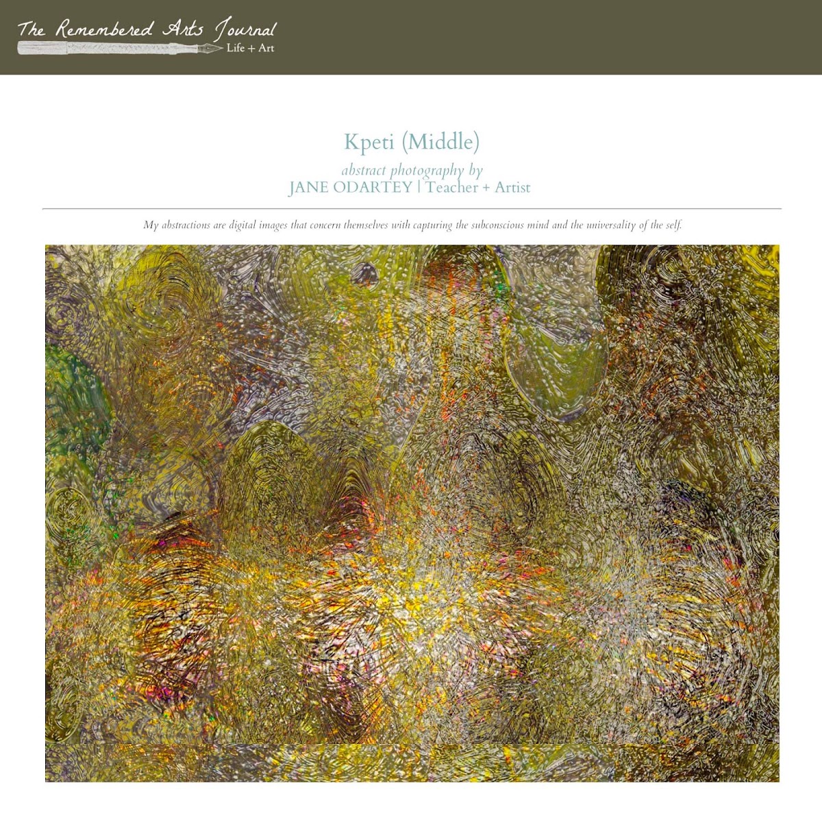 I hope things are well with you. Things are well with me, too, and I’ve something to share: In The Remembered Arts dazzling new fall issue, aptly titled, “Beauty in the Extreme,” you’ll find also a series of my new abstract images entitled Kpeti (a Krobo word––Mother’s tongue––meaning middle). I hope you’ll find the issue as well as my images interesting. Thanks. ^_^